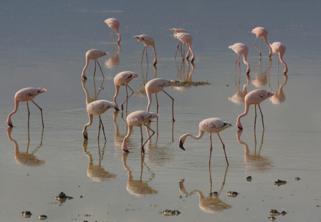 A flock of Lesser Flamingos gracefully wading in Lake Magadi, along the great Rift valley in Kenya. The image offers a glimpse into the stunning wildlife and natural landscapes that make Kajiado County a unique travel destination.